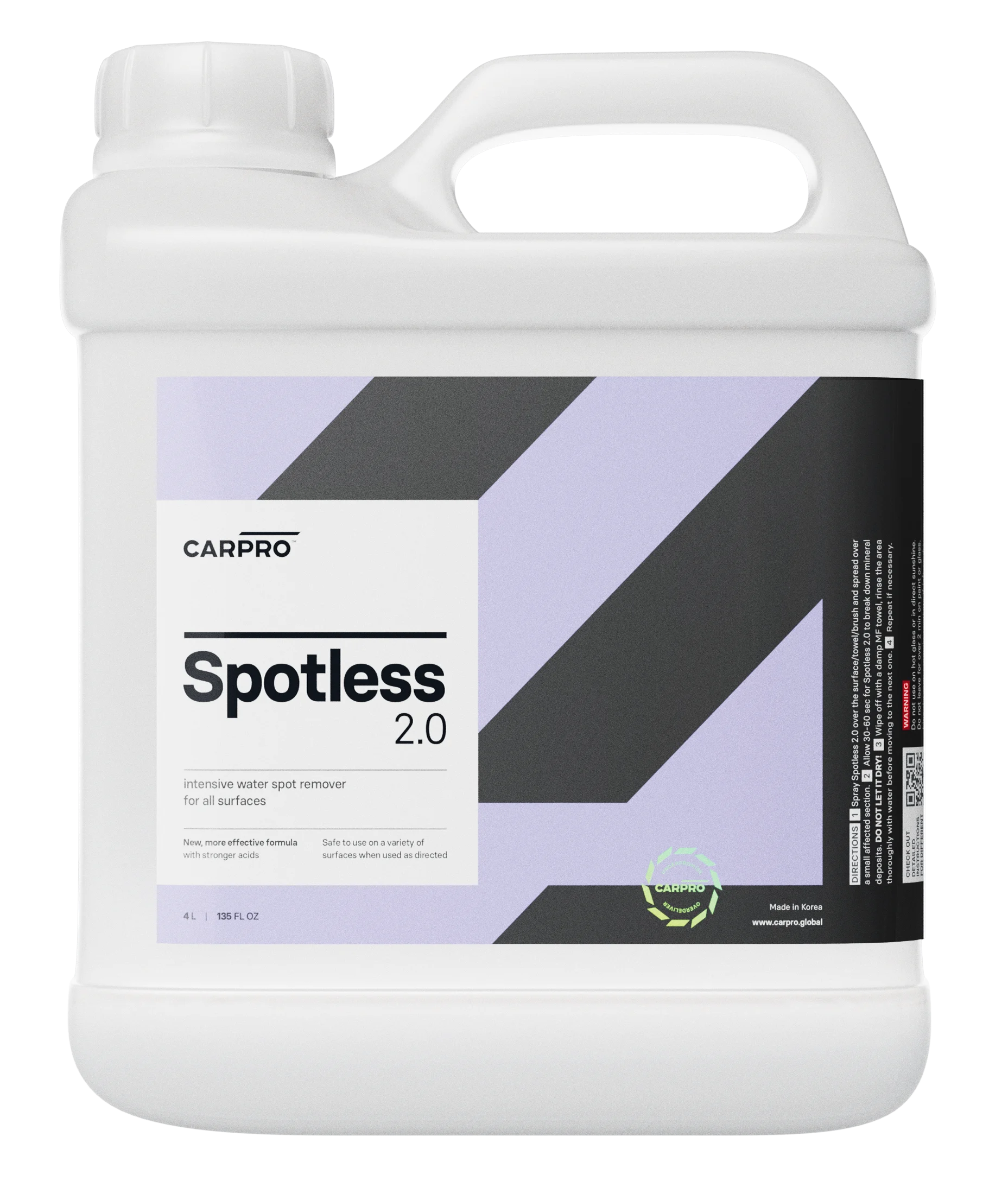 CarPro Spotless is a specialized intensive cleaner formulated to dissolve mineral deposits and water spots from automotive surfaces. It uses a carefully balanced acidic blend to break down the minerals chemically without damaging the paint. It is the most effective way to remove fresh water spots before they have a chance to etch deep into the clear coat.