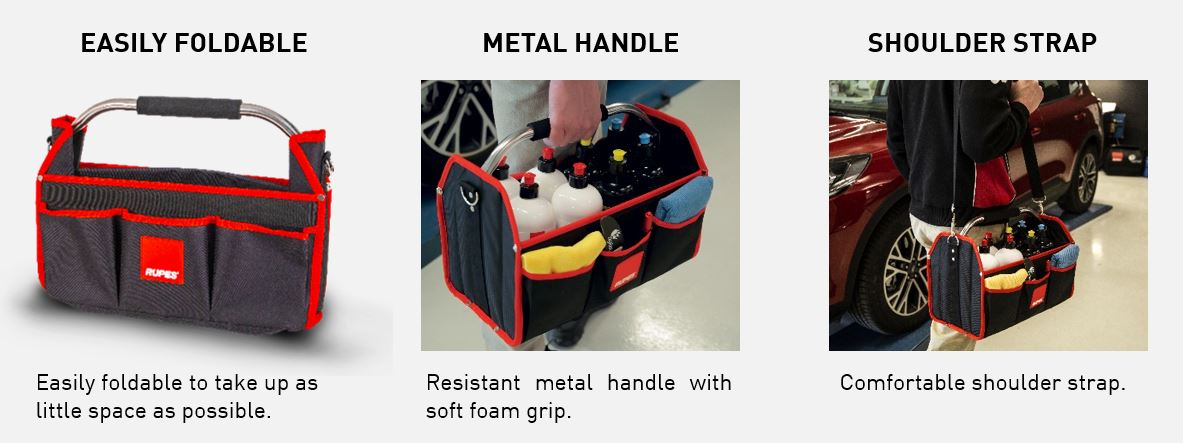 The new RUPES Bottle Carrier is the perfect solution to carry polishing compound bottles and other items you need for any detailing job. This bag includes 8 main internal compartments as well as 6 lateral pockets for accessories.